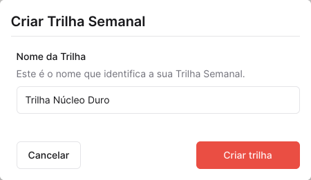 Na página das Trilhas Semanais, haverá uma botão bem grande, no meio da página, te orientando a criar a sua primeira trilha semanal. O processo é super simples, e tudo que você fazer, num primeiro momento, é adicionar um nome para ela: