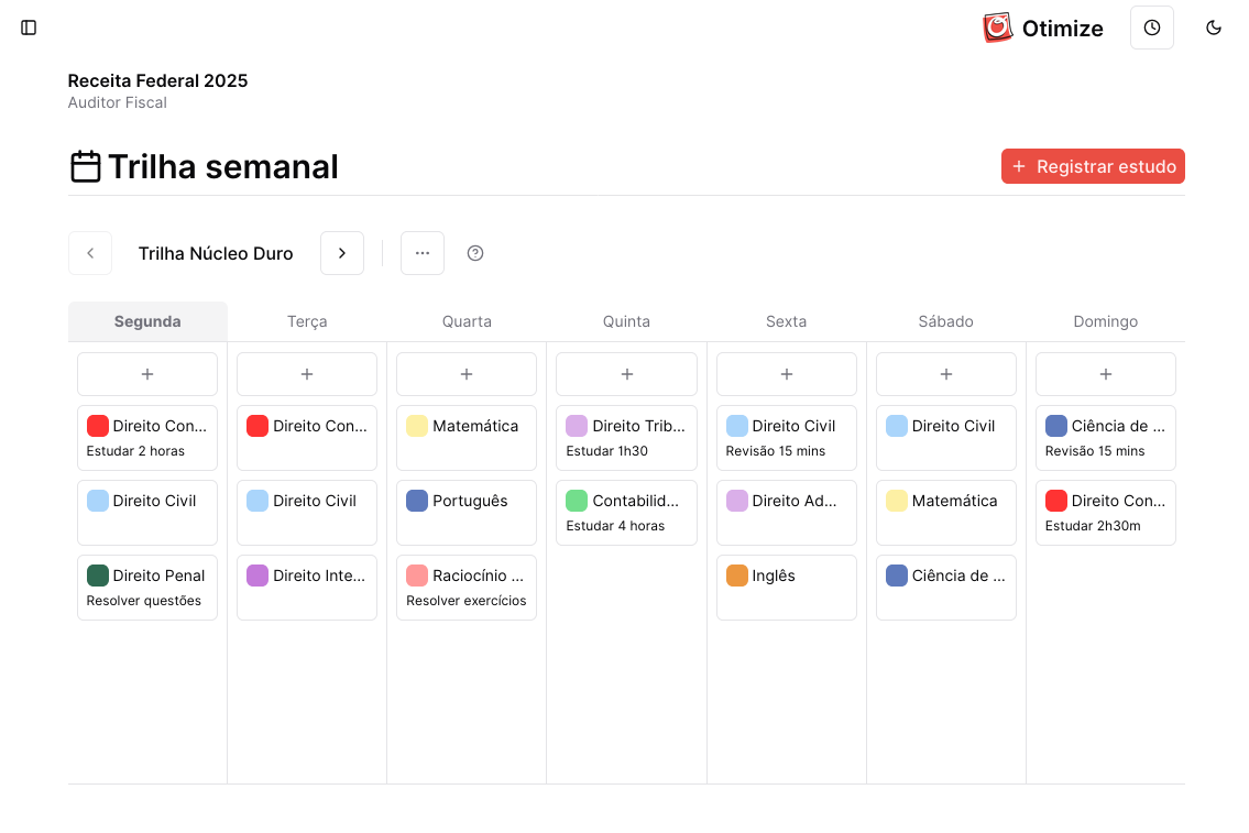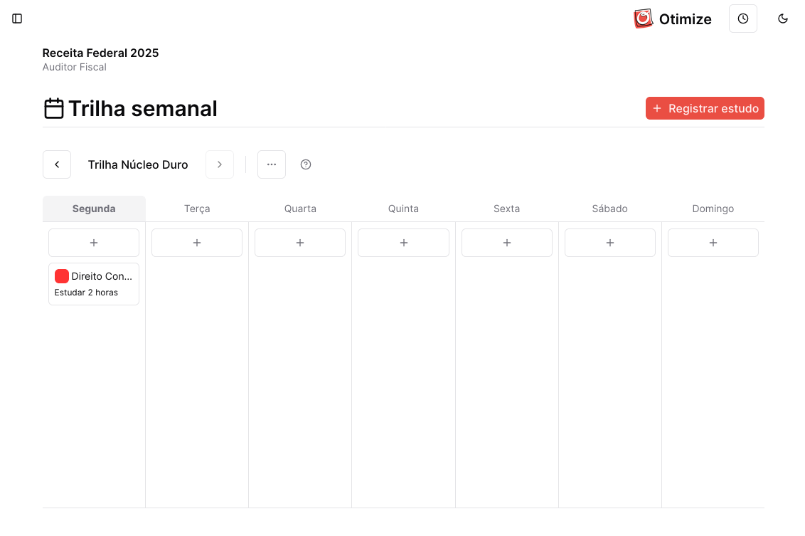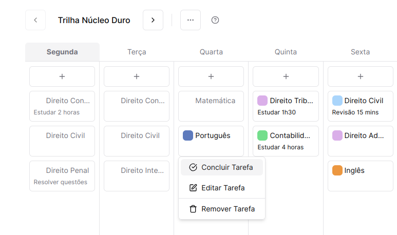 Beleza! Agora que você já criou a sua trilha, você pode começar a adicionar as tarefas a cada dia da semana. Para adicionar as tarefas, você precisa clicar no botão "+" a cada dia da semana, selecionar uma matéria relacionada (que já precisa ter sido cadastrada no seu Plano de Estudos), e adicionar uma descrição opcional.