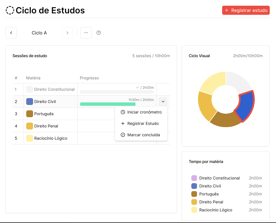 Ao iniciar os estudos do Ciclo, você primeiro estuda 2h de Português, depois 2h de Raciocínio Lógico, e assim por diante. Ao final do ciclo você terá concluído 9 horas de estudo, quando então você reinicia as sessões.