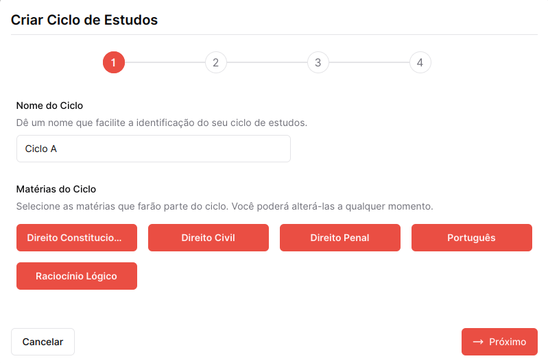 Ao clicar no botão, você será conduzido(a) para o formulário de Criação de Ciclos de Estudos de forma Automática, que contém quatro etapas. Na primeira etapa, você precisa dar um nome para o seu ciclo, e selecionar quais matérias (que já precisam estar cadastradas no seu Plano de Estudos) você deseja adicionar ao Ciclo.