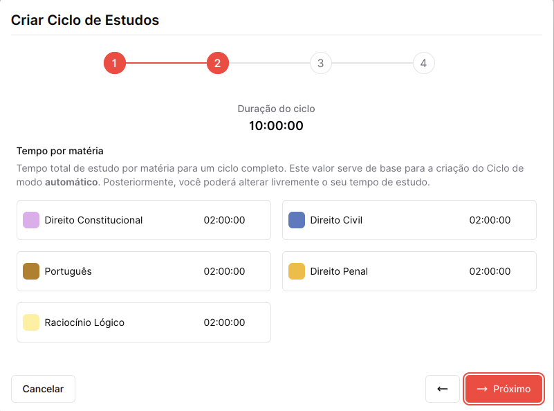 Neste exemplo, vamos considerar que cada matéria deverá ser estudada por 2 horas ao longo do ciclo: