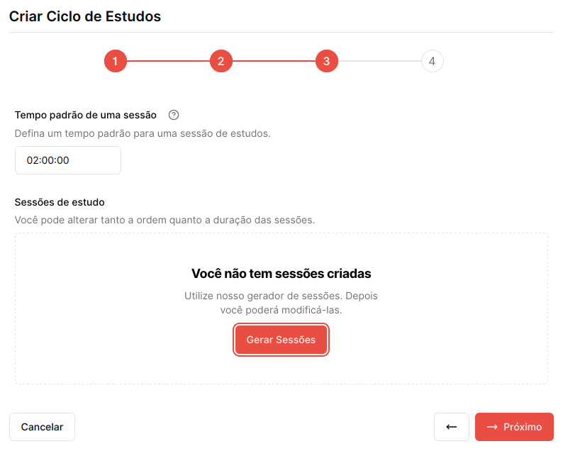 Nesta etapa, precisamos apenas informar o "tempo padrão" de uma sessão de estudo. Vou considerar que uma sessão de estudo também terá 02h00. Em seguida, vamos clicar em "Gerar Sessões":