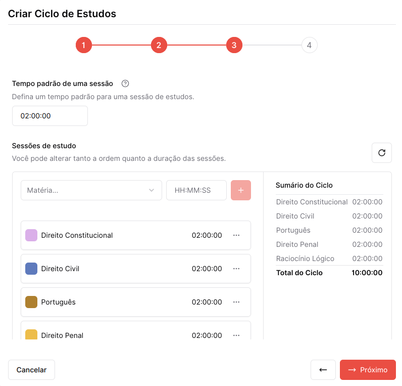 Avançando novamente, chegamos à terceira etapa do formulário. É nesta etapa que serão criadas as sessões de estudo, obedecidos os tempos configurados para cada matéria.