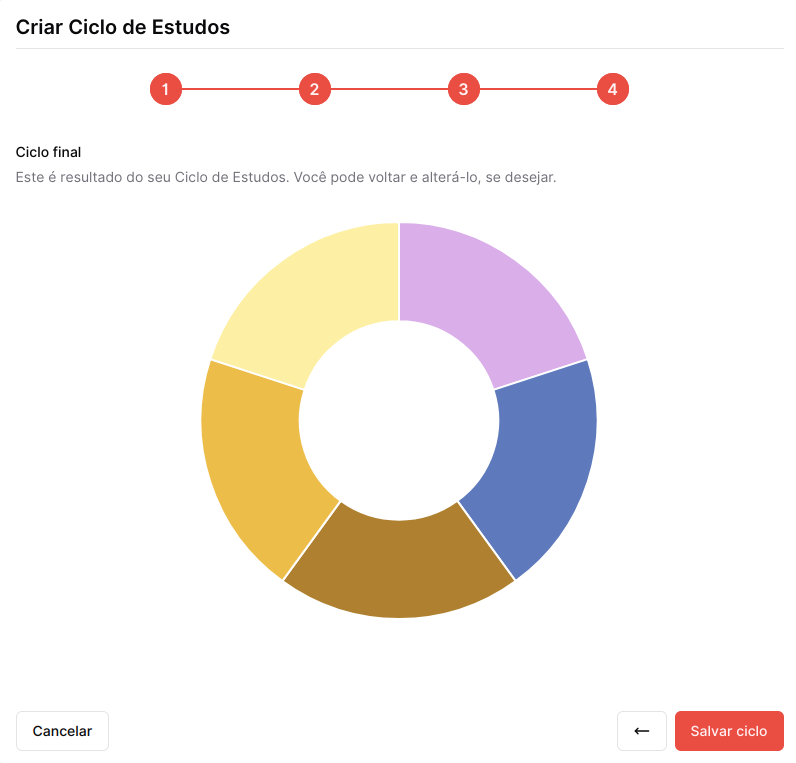 Após a criação do Ciclo, ele estará disponível na página Ciclo de Estudos. Você poderá criar múltiplos Ciclos (mas apenas um será considerado "ativo").