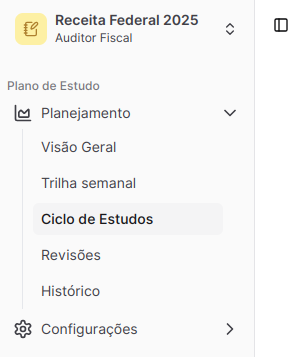 Após criar o seu primeiro Plano de Estudos (se isso é novidade para você, veja como organizar os estudos com o Rotinize), você verá na barra de navegação lateral o link para os Ciclos de Estudos: