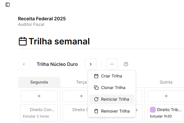 Opções para Reiniciar ou Clonar uma trilha semanal