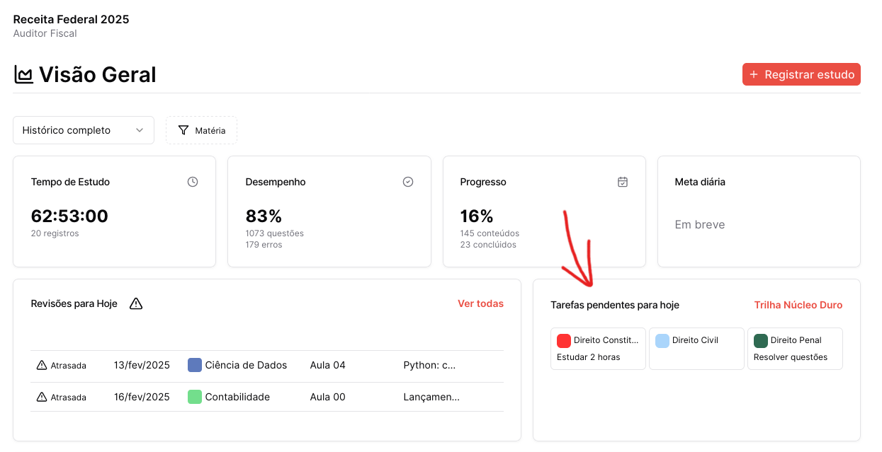 Tarefas do dia na Visão Geral do Plano de Estudos