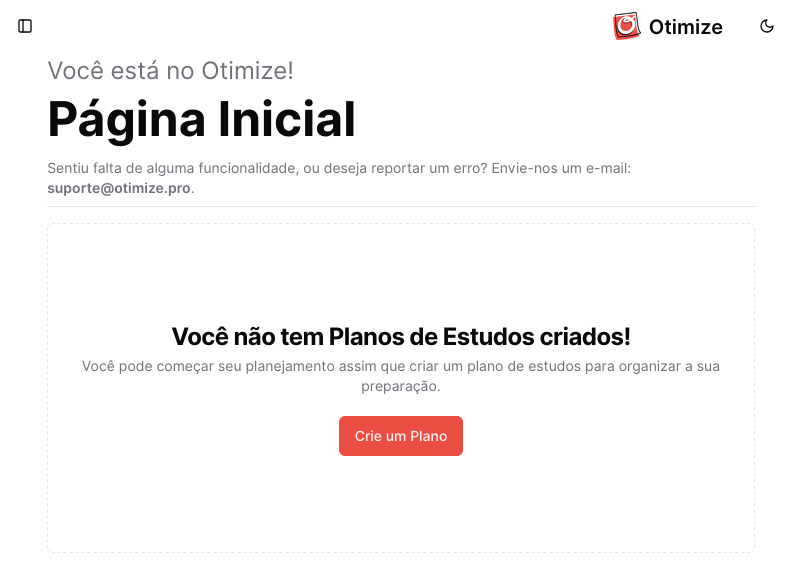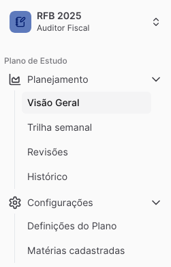 O Rotinize oferece algumas visões relacionadas ao Planejamento e Controle dos estudos. Na barra de navegação lateral, existe no link da Visão Geral, na seção do Planejamento do Plano de Estudos: