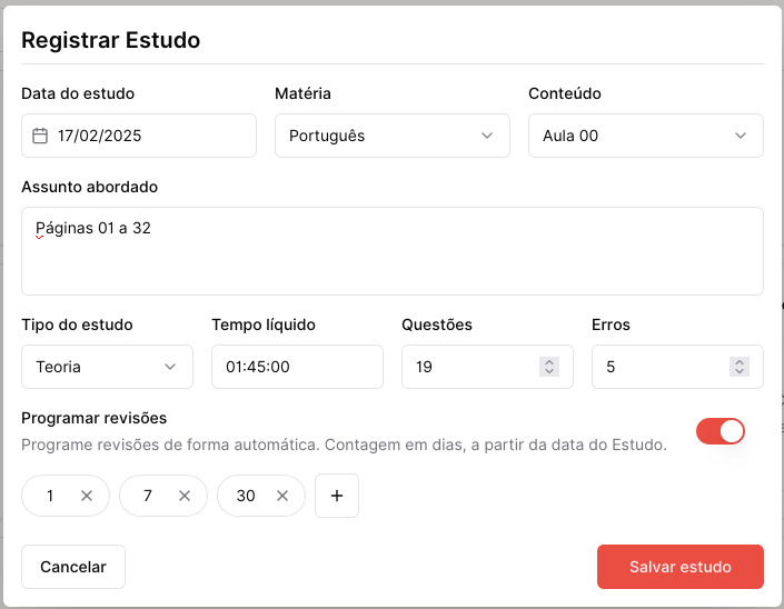 Estudo, indicando a matéria e o conteúdo estudado, além do tempo líquido e das questões resolvidas. - Durante o registro do estudo, também é possível programar revisões espaçadas automaticamente. O prazo padrão é de 1, 7 e 30 dias, mas isto pode ser configurado na aba "Configurações -> Definições do Plano" do Plano de Estudos (na barra de navegação lateral).