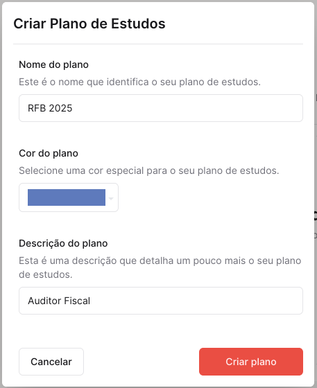 Após criar a sua conta e acessar o aplicativo do Rotinize, o primeiro passo do Zé Luis é cadastrar um novo Plano de Estudos. Vamos chamá-lo de RFB 2025: