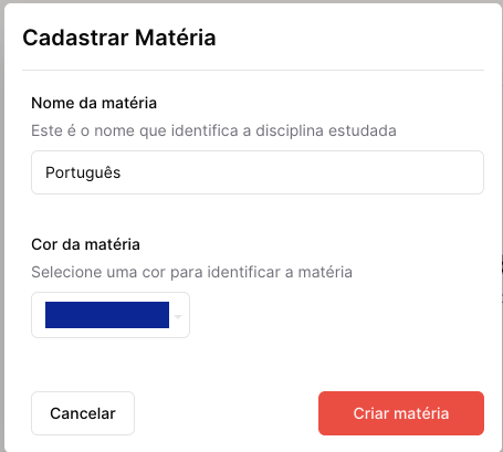 Este mesmo processo precisa ser realizado para cada matéria a ser estudada. Em nosso exemplo, o Zé Luis precisa cadastrar as seguintes matérias/conteúdos:
