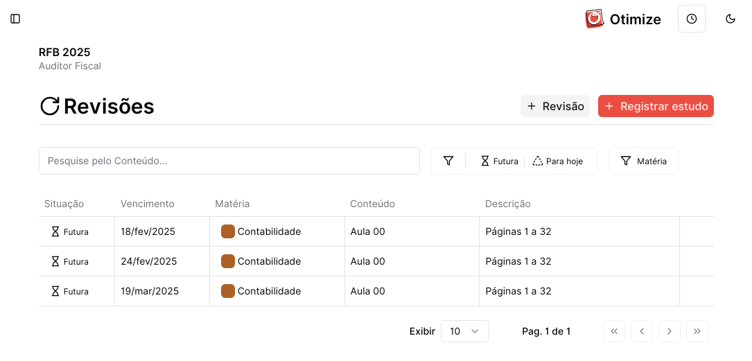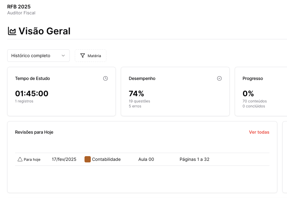 Vamos supor, então, que o primeira Estudo do Zé Luis no projeto RFB 2025 tenha sido estudar as páginas 1 a 32 da Aula 00 de Contabilidade. Ele cronometrou 01h45m líquidas de estudo, e respondeu a 19 questões no total, tendo errado 5 delas. Ele também optou por programar revisões deste conteúdo, seguindo os prazos padrões do Rotinize.