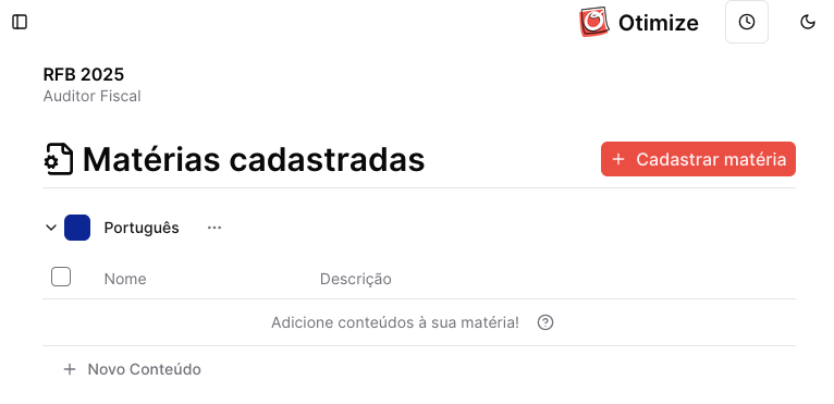 Após o cadastro, será exibida uma nova entrada na página do cadastro de matérias com o nome da matéria criada, e uma tabela vazia com os conteúdos (as aulas ou assuntos) vinculados. Neste ponto, o Rotinize vai facilitar a vida do Zé Luis mais uma vez.