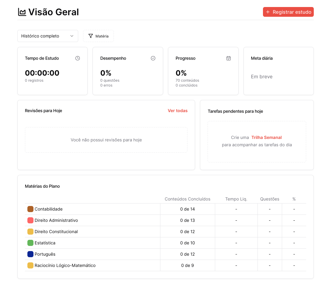 Como o Plano de Estudos acabou de ser criado pelo Zé Luis, a Visão Geral não trará muitas informações úteis. No consolidado, o resultado esperado é o seguinte: